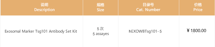 The Exosomal Marker (Tsg101) Antibody Set Kit provides an economical means to evaluate the presence of exosomal markers. The kit includes enough primary antibody to perform at least 10 western blot experiments for each target. The secondary antibody that is included in this kit has been optimized to enhance the signal-to-noise ratio. We do not recommend using other secondary antibodies with the primary antibodies at this time.