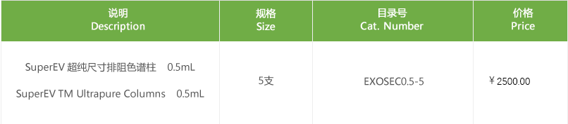 尺寸排阻色譜法(Size Exclusion Chromatography,SEC)被認(rèn)為是從不同樣本中分離和純化細(xì)胞外囊泡(EVs)的最佳方法之一,因?yàn)樗軌蚩焖俣行У貙Vs從復(fù)雜樣本中分離出來,并能保持EVs的原始形狀和生物學(xué)功能。我們開發(fā)了用于分離EVs的不同類型的SEC柱:SuperEV0.5,SuperEV1.0和SuperEV3.0,適合不同樣本和體積的EVs分離。此外,我們還提供SEC柱和濃縮柱的不同組合,既可以從更大體積的細(xì)胞培養(yǎng)上清或尿液中分離EVs,同時(shí)又可以將SEC柱分離的EVs進(jìn)一步濃縮和純化,提供完整的純凈EV的解決方法,適合于EVs的工業(yè)化制備。