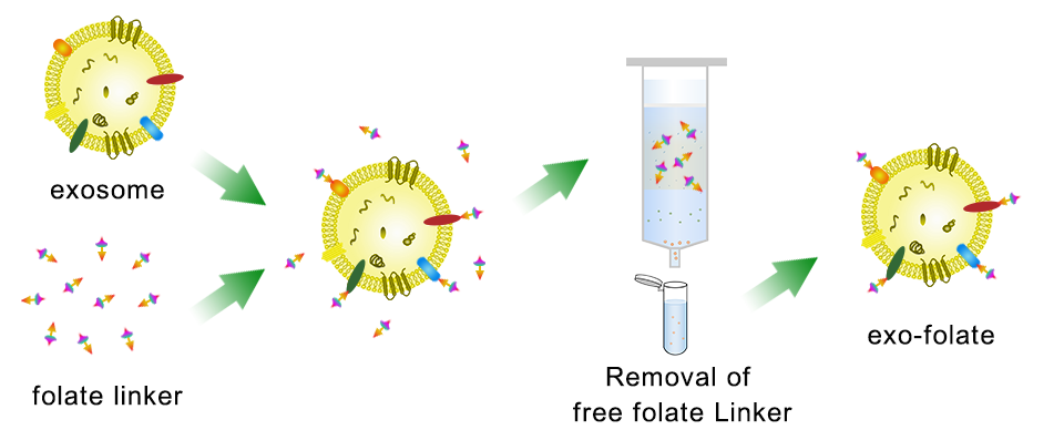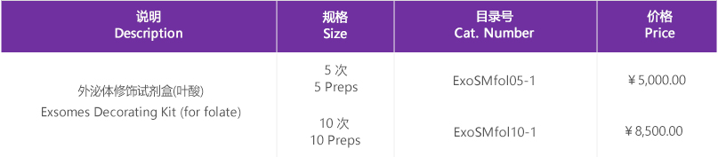 本試劑盒通過化學連接的方法,直接將葉酸以共價鍵方式偶聯(lián)在外泌體表面,再采用SEC 分子排阻柱將游離的葉酸去除,得到大量純凈的葉酸靶向外泌體。本試劑盒葉酸修飾效率高,反應條件溫和,生理條件下即可發(fā)生反應,反應特異性好,無有害副產(chǎn)物,不損傷外泌體膜結(jié)構(gòu),也不影響外泌體的生物活性和功能,為外泌體靶向提供了一種高效、簡便的修飾手段,可實現(xiàn)葉酸靶向外泌體的大規(guī)模制備。