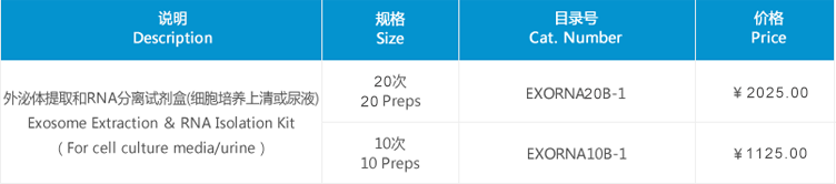 細胞培養(yǎng)上清或尿液外泌體提取和RNA分離試劑盒是包括外泌體提取和后續(xù)RNA分離、純化。首先,應用優(yōu)化的外泌體提取試劑富集細胞培養(yǎng)上清或尿液中外泌體,然后通過酚/胍鹽方法提取外泌體中總RNA(含有mRNAs和miRNAs),采用吸附柱(Spin Columns)法方便、快捷地純化和洗脫外泌體RNAs,可直接用于下游應用,如realtime RT-PCR,Northern Blotting,NGS 測序和microarray等。另外,純化的RNAs是來自外泌體中總RNAs,而不含有細胞培養(yǎng)上清或尿液中蛋白質結合的RNA(protein-bound circulating RNA)。