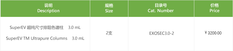 尺寸排阻色譜法(Size Exclusion Chromatography,SEC)被認為是從不同樣本中分離和純化細胞外囊泡(EVs)的最佳方法之一,因為它能夠快速而有效地將EVs從復雜樣本中分離出來,并能保持EVs的原始形狀和生物學功能。我們開發(fā)了用于分離EVs的不同類型的SEC柱:SuperEV0.5,SuperEV1.0和SuperEV3.0,適合不同樣本和體積的EVs分離。此外,我們還提供SEC柱和濃縮柱的不同組合,既可以從更大體積的細胞培養(yǎng)上清或尿液中分離EVs,同時又可以將SEC柱分離的EVs進一步濃縮和純化,提供完整的純凈EV的解決方法,適合于EVs的工業(yè)化制備。