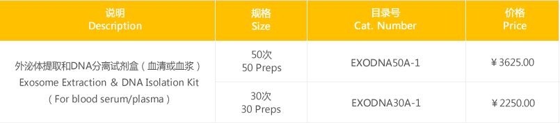 研究表明,外泌體和其它胞外囊泡中除了含有母細胞來源的不同RNAs外,在外泌體中已檢測到基因組DNA和線粒體DNA (Thakur BK et al.2014;Akiko Takahashi,et al.2017; Kalhert et al.2014),可作為疾?。ㄈ缒[瘤)的診斷標(biāo)志物及臨床用藥的指導(dǎo)和評估等。為了幫助研究人員對外泌體DNA的研究和應(yīng)用,我們研制了血清或血漿外泌體提取和DNA分離試劑盒。
